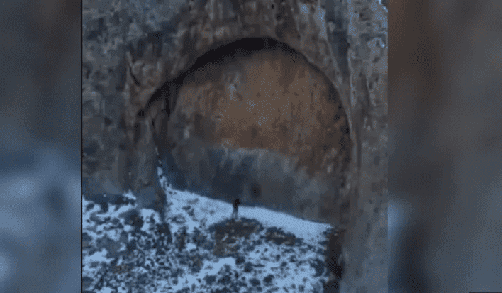 الفيديو الذي لا تتجاوز مدته 30 ثانية، نُشر أولًا على منصة Reddit ثم أعيد تداوله على موقع إكس يظهر فيه مستكشفان وهما يقتربان بحذر من التشكيل الصخري المثير للريبة وسط الثلوج، قبل أن تكشف كاميرا جوية عن ما يبدو أنه مدخل نصف دائري ضخم، يشبه أبواب المعابد أو الحصون القديمة.