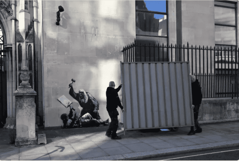 لوحته الأخيرة كانت حدثا ثقافيا وسياسيا وإعلاميا ثريا، فقد فاجأ البريطانيين والعالم بلوحة لاذعة وناقدة رسمها على إحدى الواجهات الخارجية لمبنى المحاكم الملكية في العاصمة البريطانية، تمثل قاضيا منحنيا حاملا مطرقته فوق متظاهر مطروح أرضا، بعد يومين من توقيف نحو 900 شخص في لندن خلال مظاهرة داعمة لمجموعة "فلسطين أكشن" المحظورة.
