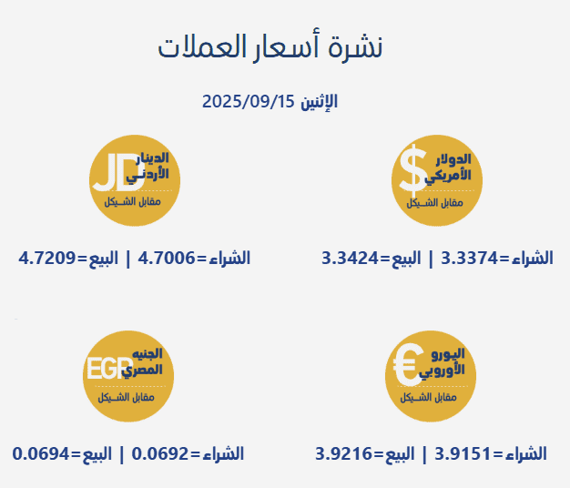 جاءت أسعار صرف العملات مقابل الشيقل الإسرائيلي، اليوم الإثنين، بحسب سلطة النقد الفلسطينية، على النحو التالي: