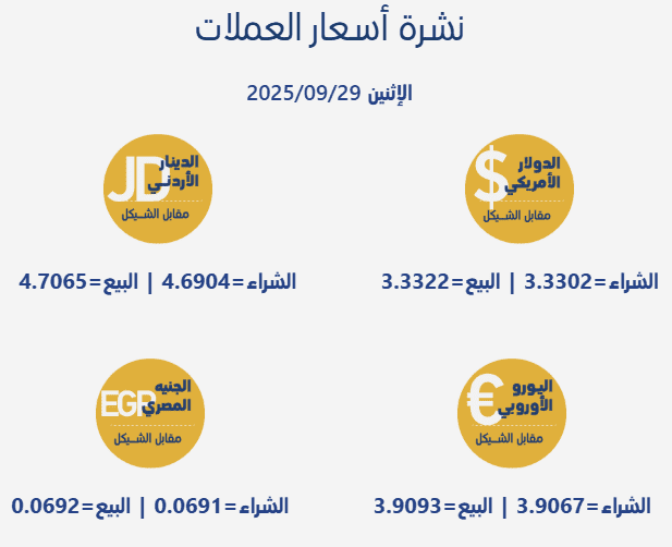 جاءت أسعار صرف العملات مقابل الشيقل الإسرائيلي، اليوم الإثنين، بحسب سلطة النقد الفلسطينية، على النحو التالي: