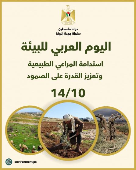 تُحيي دولة فلسطين ممثلة بسلطة جودة البيئة، اليوم العربي للبيئة الذي يصادف الرابع عشر من تشرين الأول/ أكتوبر من كل عام، والذي أقرّه مجلس الوزراء العرب المسؤولين عن شؤون البيئة لهذا العام 2025 تحت شعار " استدامة المراعي الطبيعية وتعزيز القدرة على الصمود".