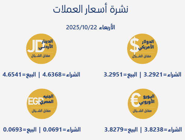 جاءت أسعار صرف العملات مقابل الشيقل الإسرائيلي، اليوم الأربعاء، بحسب سلطة النقد الفلسطينية، على النحو التالي:
