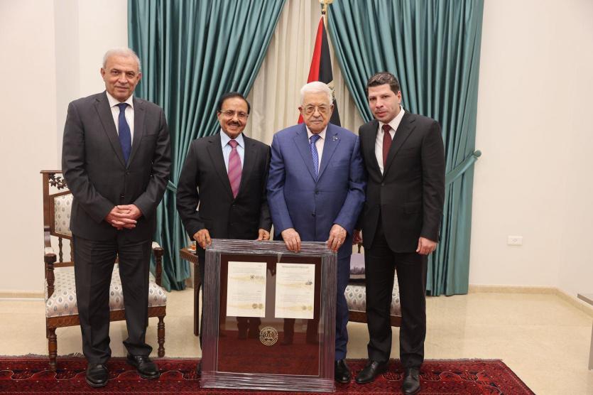 رئيس مجلس إدارة الجامعة العربية الأمريكية يهدي فخامة الرئيس محمود عباس قلادة رمزية لميلاد دولة فلسطين