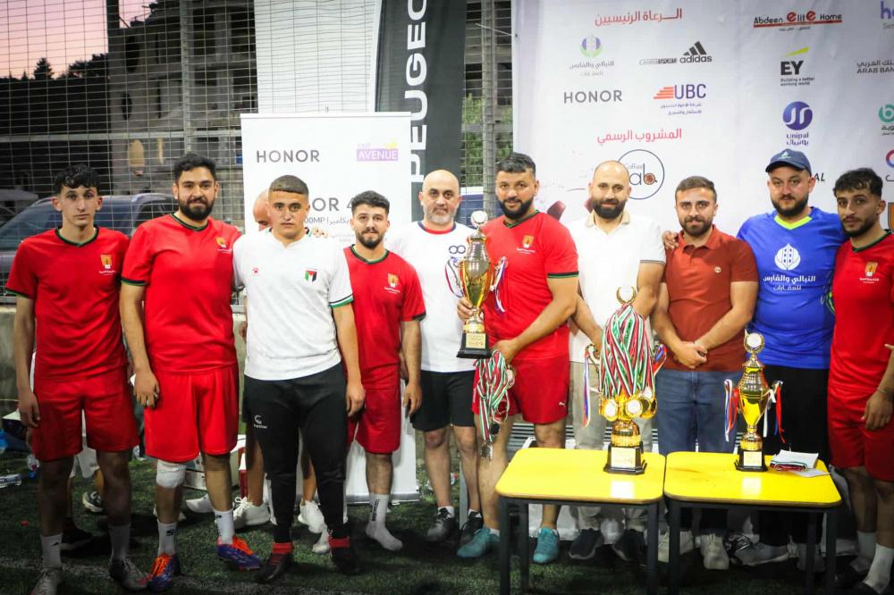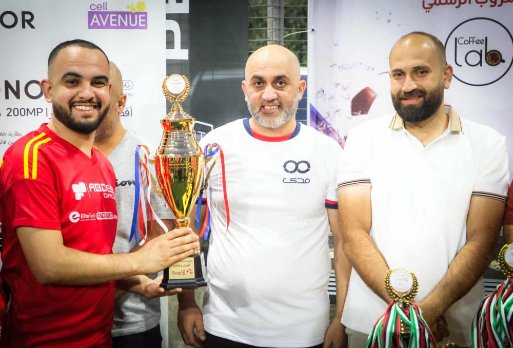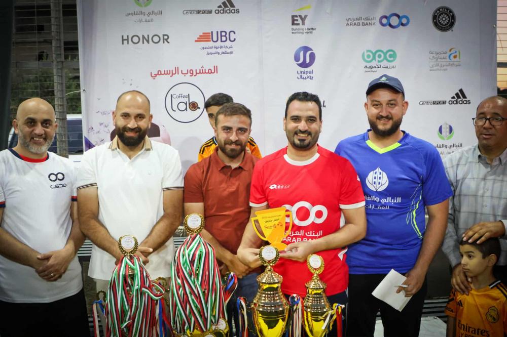 وفي نهاية البطولة تم تتويج الفرق الفائزة بحضور ممثلي الشركات الراعية والفرق المشاركة،وقد تم تقديم جوائز البطولة على النحو التالي، أفضل حارس مرمى اللاعب منير قنداح من فريق البنك العربي، وأفضل لاعب مروان ترابين من فريق شركة عابدين اليت هوم، وهداف البطولة اللاعب محمود أبو عيوش من فريق شركة بيرزيت للأدوية والفريق المثالي شركة يونيبال وكأس المركز الثالث عابدين اليت هوم وكأس المركز الثاني وميداليات فضية الاكاديمية العربية للتعليم الحديث وكأس المركز الأول وميداليات ذهبية فريق البنك العربي.