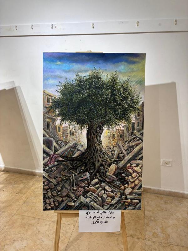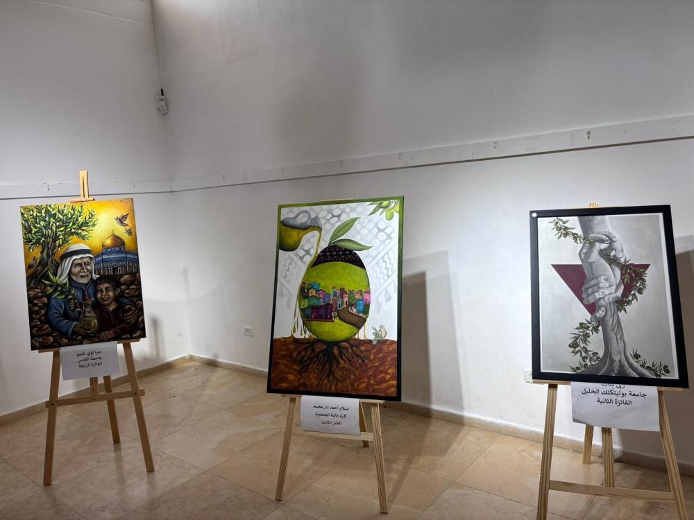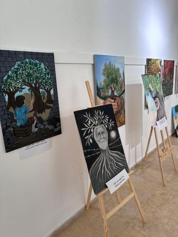 وتجول المشاركون في المعرض الفني لمسابقة (باقون كجذور الزيتون) لطلبة مؤسسات التعليم العالي، الذي نظم بالشراكة مع وزارة التربية والتعليم العالي مع 11 جامعة، وشمل 91 لوحة.