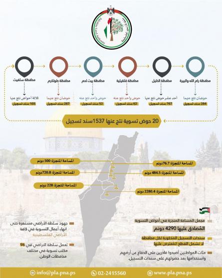 وأوضحت سلطة الأراضي أن مجموع المساحات التي جرى استكمال إجراءات التسوية والمصادقة عليها من قاضي التسوية بلغ 4290 دونماً في المحافظات الست. وقد جاءت هذه المساحات بواقع 2280.4 دونم في محافظة الخليل، و228 دونماً في محافظة بيت لحم، و500 دونم في محافظة طولكرم، و76.7 دونماً في محافظة قلقيلية، و484.5 دونماً في محافظة رام الله والبيرة، و720.8 دونماً في محافظة سلفيت، ما يعكس تقدماً واضحاً في سير أعمال التسوية خلال الفترة الأخيرة.