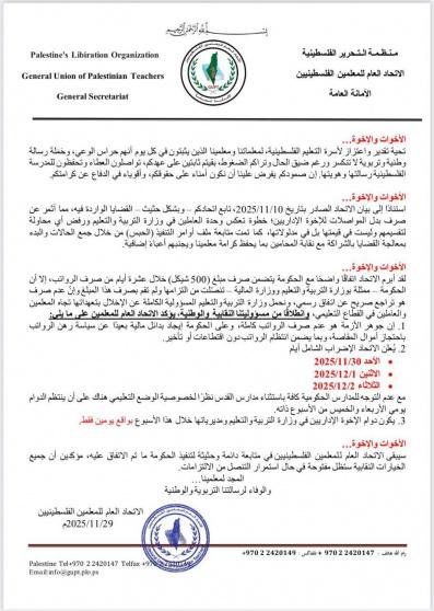 وبين الاتحاد أنه ومنذ صدور بيانه السابق بتاريخ 10 تشرين الثاني/نوفمبر 2025، واصل متابعة القضايا المطلبية، الأمر الذي أثمر عن صرف بدل المواصلات للإخوة الإداريين، في خطوةٍ عكست وحدة العاملين في وزارة التربية والتعليم ورفض محاولات التفرقة بينهم. كما تمت معالجة ملف أوامر التنفيذ (الحبس) بالتعاون مع نقابة المحامين الفلسطينيين بما يحفظ كرامة المعلمين ويجنبهم أعباء إضافية.
