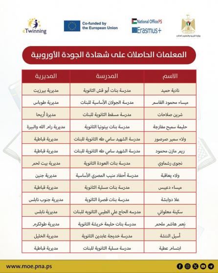 حصدت وزارة التربية والتعليم العالي، بالشراكة مع مكتب الدعم الوطني/ إيراسموس في فلسطين وبدعم من الاتحاد الأوروبي، سبع عشرة شهادة جودة أوروبية ضمن مشروع التوأمة الإلكترونية، وذلك بعد حصول المشاريع الفلسطينية على شهادة الجودة الوطنية وترشيحها للمنافسة على المستوى الأوروبي.