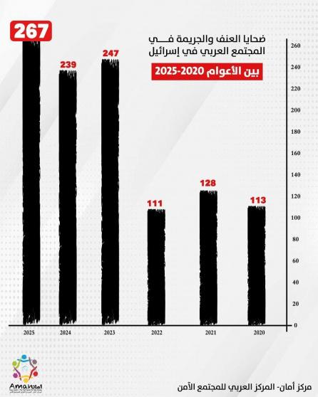 ووفق إحصائيّات مركز أمان، سُجِّلت 267 جريمة قتل منذ مطلع عام 2025 في المجتمع العربي، بينها 144 جريمة وقعت في وضح النهار، في مؤشر خطير على أنّ القتل لم يعد يجري في الخفاء، بل بات يحدث في ساعات الحياة اليومية وفي الفضاء العام. كما تشير المعطيات إلى أنّ ما يقارب ثلاثة أرباع الضحايا ينتمون إلى الفئة العمرية 18–39 عامًا، وهي الفئة الأكثر حيوية اقتصاديًا واجتماعيًا.