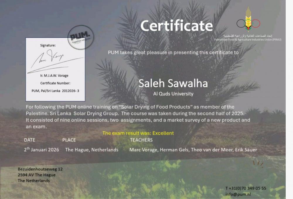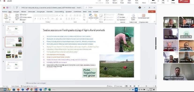 اختتم اتحاد الصناعات الغذائية والزراعية الفلسطينية وبالتعاون مع برنامج الخبراء الهولنديين PUM دورة تدريبية متخصصة بعنوان "تجفيف الأغذية باستخدام الطاقة الشمسية"، وذلك عبر تقنية Microsoft Teams ، قدمها عدد من الخبراء الهولنديين المتخصصين في قطاع الصناعات الغذائية بمشاركة عدد 9 مصانع اغذية فلسطينية وعدد 3 خبراء متختصصين في قطاع إنتاج الخضروات والفواكه والاصناف التقليدية والمنتجات المجففة.
