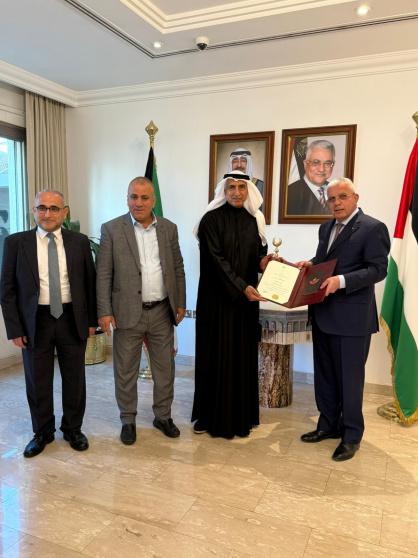 ونيابة عن الرئيس، قلد سفير دولة فلسطين في الكويت رامي طهبوب، السعد وسام نجمة الاستحقاق في مقر السفارة، اليوم الثلاثاء، بحضور مستشار رئيس الوزراء للصناديق العربية والإسلامية الوزير ناصر قطامي، ومستشار رئيس الوزراء للشؤون الاقتصادية باسم عبد الحليم.