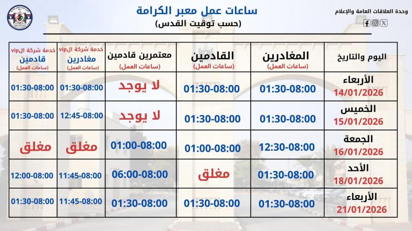 الهيئة العامة للمعابر تعلن ساعات عمل معبر الكرامة خلال الأيام المقبلة