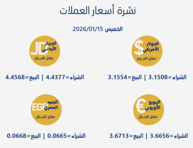 جاءت أسعار صرف العملات مقابل الشيقل الإسرائيلي، اليوم الخميس، بحسب سلطة النقد الفلسطينية، على النحو التالي: