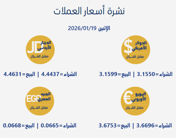 جاءت أسعار صرف العملات مقابل الشيقل الإسرائيلي، اليوم الإثنين، بحسب سلطة النقد الفلسطينية، على النحو التالي: