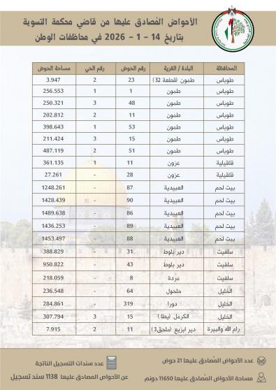 أعلنت سلطة الأراضي الفلسطينية عن إنجاز جديد ضمن أعمال مشروع تسوية الأراضي، تمثل في المصادقة على 21 حوض تسوية من قبل قاضي التسوية، نتج عنها إصدار 1138 سند تسجيل بعد استكمال الإجراءات القانونية المعتمدة.