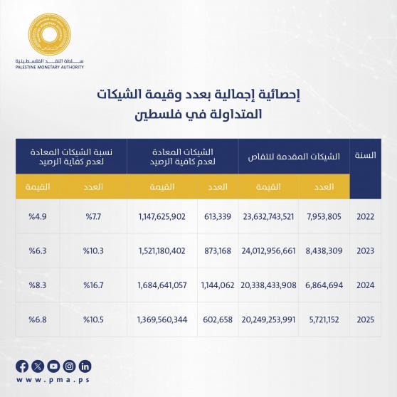 أصدرت سلطة النقد إحصائية سنوية حول الشيكات المتداولة في فلسطين للعام 2025، أظهرت تداول 5.7 مليون شيك بقيمة إجمالية بلغت 20.25 مليار دولار، أعيد منها لعدم كفاية الرصيد 602 ألف شيك بقيمة 1.37 مليار دولار، ما يشكل 10.5% من حيث العدد و6.8% من حيث القيمة.