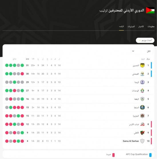 واستغل نادي الحسين إربد تعثر الفيصلي على أكمل وجه، حيث انقض على الصدارة برصيد 31 نقطة بعد فوزه العريض في وقت سابق من هذه الجولة، ليصبح "الملكي" هو الرقم الأصعب في معادلة الموسم الحالي.