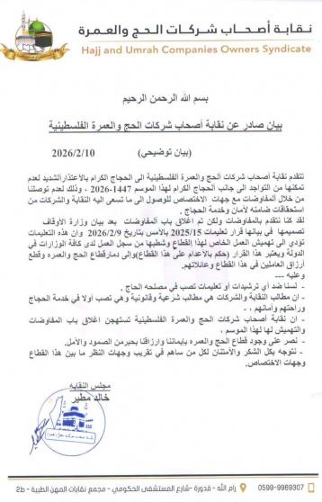 أعربت نقابة أصحاب شركات الحج والعمرة الفلسطينية عن اعتذارها الشديد للحجاج الكرام لعدم تمكنها من التواجد إلى جانبهم خلال موسم الحج لعام 1447هـ/2026م، نتيجة تعثر المفاوضات مع جهات الاختصاص وعدم التوصل إلى تفاهمات تضمن أمن الحجاج وخدمتهم.