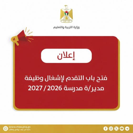أعلنت وزارة التربية والتعليم فتح باب التقدم لإشغال وظيفة مدير/ة مدرسة للعام الدراسي 2027/2026، اعتبارا من يوم الأحد 15/02/2026ولغاية يوم الثلاثاء 24/02/2026.