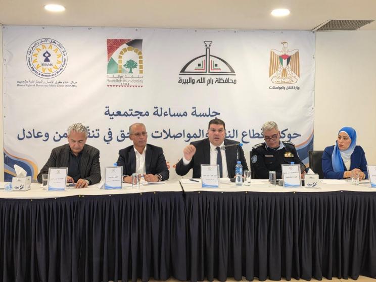 نظم مركز إعلام حقوق الإنسان والديمقراطية "شمس"، جلسة مساءلة مجتمعية حول "حوكمة قطاع النقل والمواصلات: الحق في تنقل آمن وعادل"، حضرها ممثلون/ات عن مؤسسات المجتمع المدني الفلسطينية (الحقوقية، النسوية، الشبابية، التنموية)، ممثلون/ات عن المؤسسات الرسمية المدنية والأمنية، ممثلون/ات عن النقابات والاتحادات ذات الصلة، محامين، باحثين وأكاديميين، وناشطين مجتمعيين.