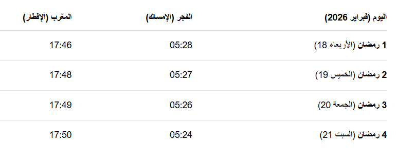 إليك جدول تقريبي لمواقيت الأيام الأولى في العاصمة روما (قد تختلف الدقائق حسب المدينة مثل ميلانو أو نابولي)