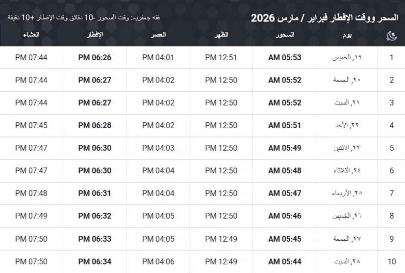 جدول إمساكية رمضان 2026 للولايات (صلالة، صحار، نزوى)