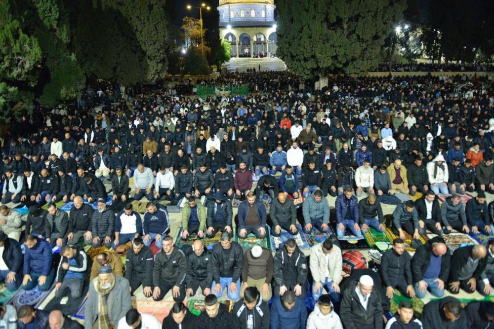 أدى نحو 100 ألف مصلٍ، مساء اليوم الجمعة، صلاتي العشاء والتراويح في رحاب المسجد الأقصى المبارك بالقدس المحتلة.