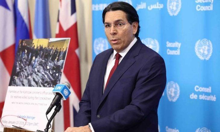 قال سفير إسرائيل لدى الأمم المتحدة، داني دانون، في تصريحات مقتضبة أمام الصحافة خارج قاعة مجلس الأمن، الإثنين، إن الحرب على إيران لن تتوقف إلا بعد تحقيق أهداف إسرائيل، رغم التضحيات الكبيرة. وعرض السفير صوراً لثلاثة من القتلى الذين سقطوا في مستوطنة “بيت شيمش”، متهمًا إيران باستهداف المدنيين.