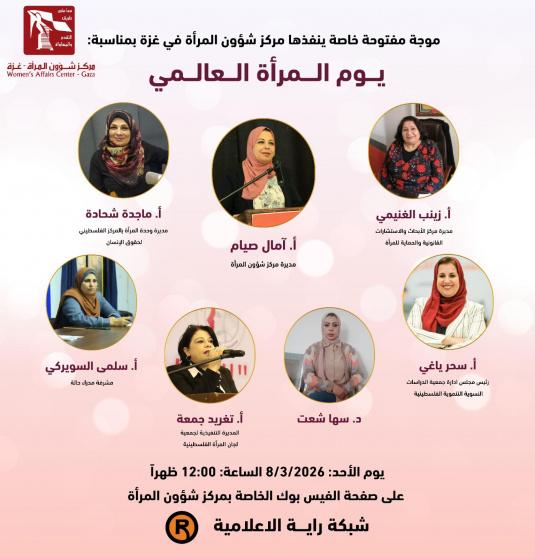 خصصت شبكة رايـــة الإعلامية موجة خاصة بتنفيذ من مركز شؤون المرأة في غزة بمناسبة يوم المرأة العالمي، الذي يصادف الثامن من آذار/مارس من كل عام، للحديث عن واقع النساء في قطاع غزة بعد أكثر من عامين من الحرب وما خلفته من مآسٍ إنسانية واجتماعية عميقة.