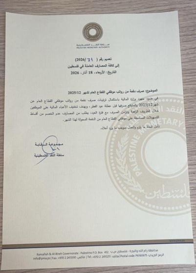 ويأتي ذلك بالتزامن مع إعلان وزارة المالية والتخطيط أن صرف رواتب الموظفين العموميين عن شهر كانون الأول 2025 سيتم اليوم الأربعاء 18/3/2026، بنسبة 50% من قيمة الراتب وبحد أدناه 2000 شيكل.