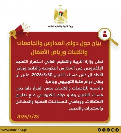 أعلنت وزارة التربية والتعليم العالي اليوم السبت، عن استمرار التعليم الإلكتروني في المدارس الحكومية والخاصة ورياض الأطفال حتى مساء الاثنين 2026/3/30، على أن يبقى دوام طلبة التوجيهي وجاهياً.