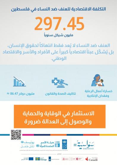 وأشارت إلى أن التكلفة الاقتصادية السنوية الإجمالية للعنف ضد النساء في فلسطين تُقدر بحوالي 297.45 مليون شيقل، وتشمل هذه التكاليف ما يتحمله الأفراد والأسر، إضافة إلى تكلفة عدم التحرك، مثل فقدان الإنتاجية، وفقدان أعمال الرعاية غير المدفوعة، والمصروفات الشخصية. كما تشمل التكاليف التي تتحملها المؤسسات ومقدمو الخدمات الذين يتعاملون مع حالات العنف ويقدمون الخدمات اللازمة.