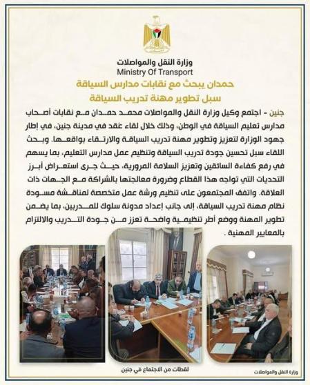 اجتمع وكيل وزارة النقل والمواصلات محمد حمدان مع نقابات أصحاب مدارس تعليم السياقة في الوطن، وذلك خلال لقاء عقد في مدينة جنين، في إطار جهود الوزارة لتعزيز وتطوير مهنة تدريب السياقة والارتقاء بواقعها.