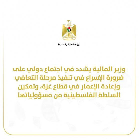 في اجتماع دولي: وزير المالية يؤكد أهمية الإسراع في تنفيذ مرحلة التعافي وإعادة الإعمار في قطاع غزة
