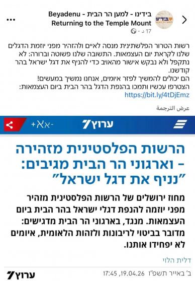 حذّرت محافظة القدس من تصاعد دعوات تحريضية تنشرها منصات تابعة لجماعات ما يسمى "الهيكل" المتطرفة، لحشد أنصارها لاقتحام المسجد الأقصى المبارك ورفع علم الاحتلال داخله، يوم الأربعاء المقبل، تحت ذريعة ما يسمى "يوم الاستقلال"، معتبرة ذلك خطوة استفزازية خطيرة واعتداءً مباشراً على حرمة المسجد، ومحاولة مكشوفة لفرض واقع تهويدي بالقوة.