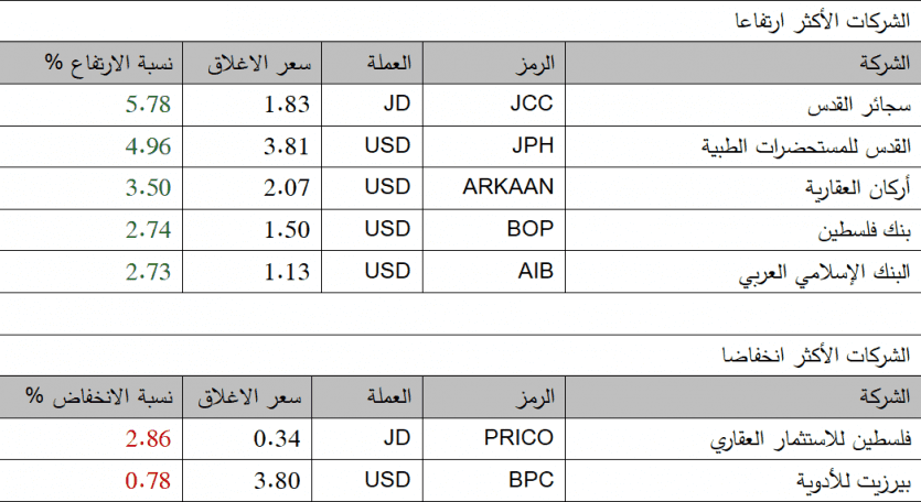 وحسب تقرير لبورصة فلسطين، فقد شهدت جلسة اليوم تداولات بلغت قيمتها 92,953 دولار، فيما بلغ الحجم الإجمالي للأسهم المتداولة 50,789 سهما، وشهد السوق اليوم 54 صفقة.