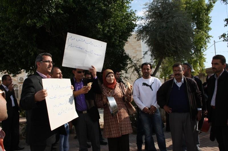 نفذ عشرات المعلمون اعتصاما امام مقر محافظة اريحا والاغوار احتجاجا على تاخر صرف الرواتب وعدم انتظام صرفها وطالب المعلمون الحكومة الفلسطينية بالعمل على سرعة صرف الراتب وعدم تجزئتة معبرين عن عدم قدرتهم للوصول الى اماكن عملهم لضيق الحال,
