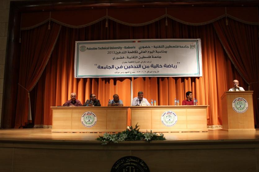 نظمت ، اليوم ، جامعة فلسطين التقنية – خضوري ، ندوة علمية وتثقيفية بعنوان ( رياضة خالية من التدخين في الجامعة ) ، وذلك من خلال دائرة الدراسات والتنمية المجتمعية ، التابعة لعمادة التنمية وخدمة المجتمع ، وبالتعاون مع لجنة مكافحة التدخين ، المشكلة من وزارة الصحية ، وتعمل في منطقة طولكرم تحت إشرافها، ورئيسها الدكتور تيسير الجمل، من مديرية صحة محافظة طولكرم .