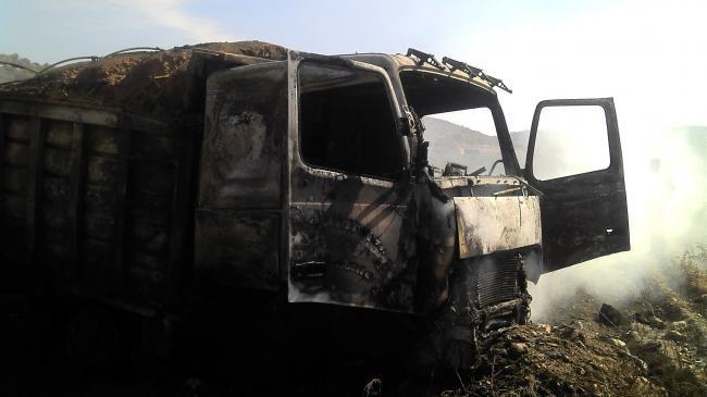 بالصور: انقلاب شاحنة واحتراقها في طولكرم