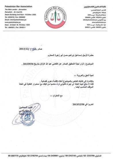 وأضاف المحامي إسماعيل أبو زهيرة في رسالة بعد صدور قرار لجنة التحقيق المكلّفة من المحكمة العليا بتبرئته من التهم المنسوبة إليه:"أناشد الرئيس الفلسطيني قائد المركبة وحافظ القانون بأن ينصفني، لأنه تم تهديدي من جهة خاصة بأن رأسي مطلوب للسلطة في حال رفعت قضية على مرتكبي الانتهاك بحقي، ومنذ شهرين قدمت كتابا رسميا لمقابلة الرئيس ولغاية الآن لم يتم الردّ على طلبي، متمنيا لقاءه حتى ينصفني" .