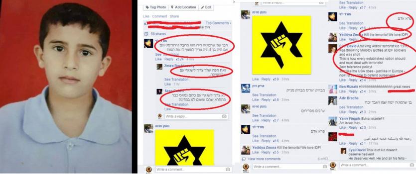 اجتاحت تعليقات الاسرائيلين عقب نشر " رايــة" صورة للشهيد الطفل بهاء بدر 13 عاما وهو طالب في الصف السابع على "فيس بوك" " تسخر " من العرب وتمدح الجيش الاسرائيلي على قتل الطفل حيث اعتبروها خطوة في الاتجاه الصحيح وان اسرائيل بذلك ستقضي على ما اسموه " الارهاب" . !!