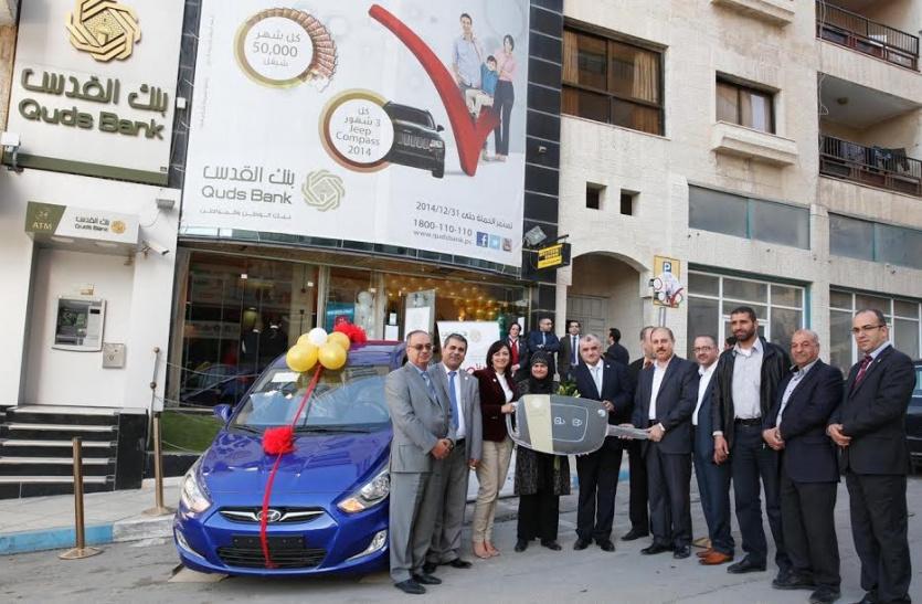بنك القدس يسلم الفائزة لدى فرع نابلس الجديد سيارة هيونداي اكسنت 2014