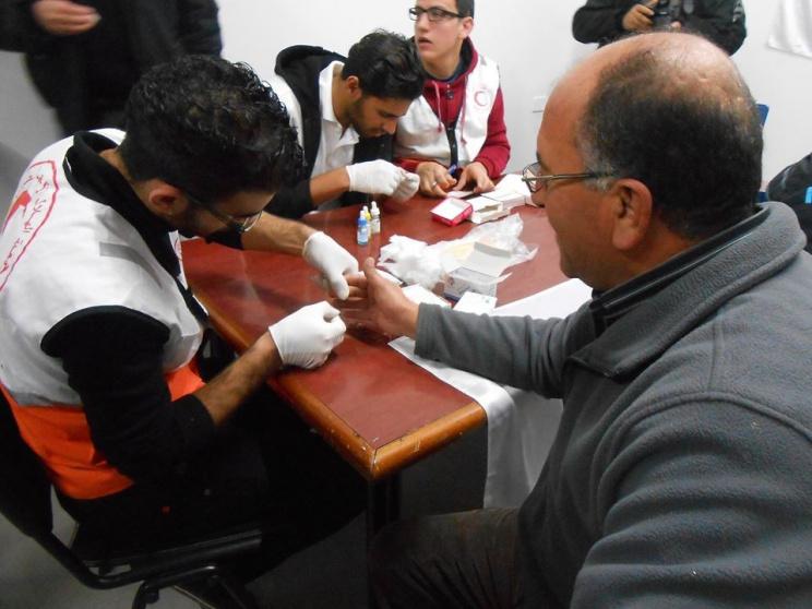 أجرت بلدية الخليل بالتعاون مع الهلال الأحمر الفلسطيني، اليوم الثلاثاء، فحص دم لسائقي المركبات العمومية داخل محطة بلدية الخليل المركزية.