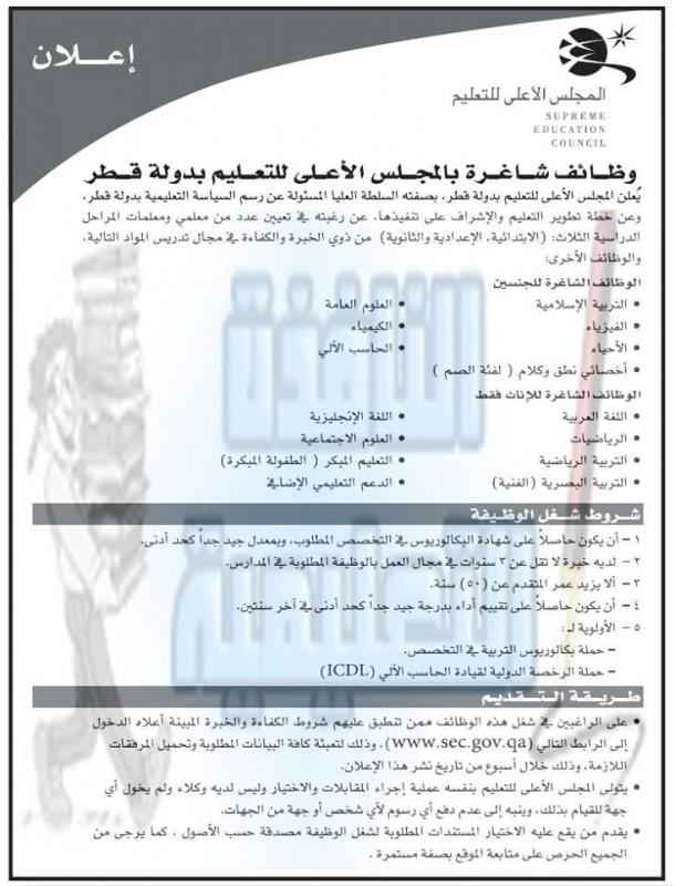 أعلن المجلس الأعلى للتعليم بدولة قطر، عن نيته تعيين عدد من المعلمين والمعلمات الفلسطينيين في قطاع غزة، للمراحل الدراسية الثلاث "الابتدائية والإعدادية والثانوية"، من أصحاب الخبرة والكفاءة.