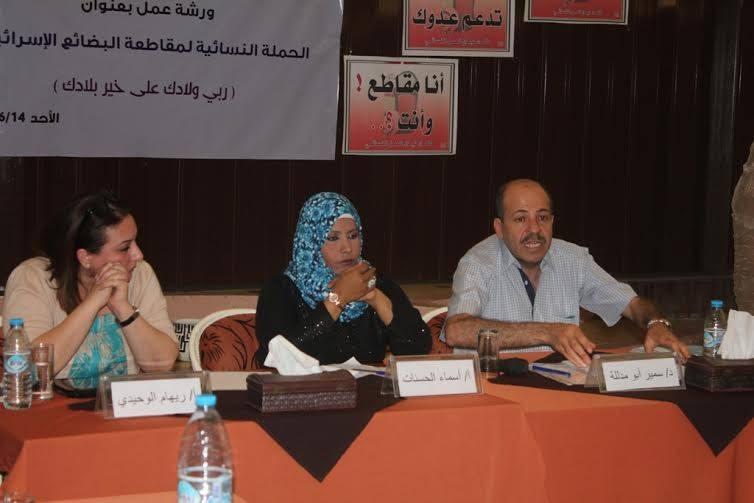ويشار إلى أن النساء المنظمات عُلقن على جدران مكان عقد الورشة يافطات كتب عليها: (لا تدفع ثمن الرصاصة التي تقتل بها، لا تدعم عدوك، أنا مقاطع وأنت!؟، لا تدخل منتجات المستوطنات إلى بيتك، والمقاطعة شكل من أشكال المقاومة).