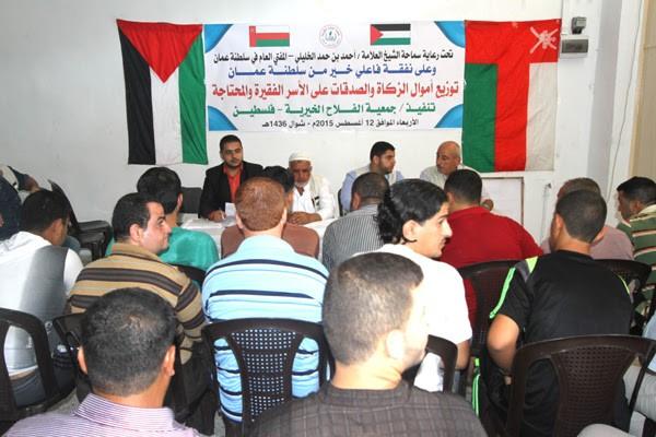 وزعت جمعية الفلاح الخيرية في فلسطين اليوم مساعدات مالية عمانية لمئات الأسر الفقيرة والمحتاجة في محافظات قطاع غزة بدعم كريم من أهل الخير في سلطنة عمان وبرعاية كريمة من سماحة الشيخ العلامة/أحمد بن حمد الخليلي – المفتي العام في سلطنة.