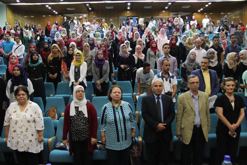 حيث افتتح المهرجان بآيات من الذكر الحكيم، ثم السلام الوطني الفلسطيني وكلمة الدكتور محمد العملة نائب رئيس الجامعة للشؤون الاكاديمية متحدثا باسم ا.د ماهر النتشة القائم باعمال رئيس الجامعة، التي اكد في كلمته على دعم الجامعة لهذا المهرجان لما له من اهمية في دعم طلبة الاعلام في الجامعة.