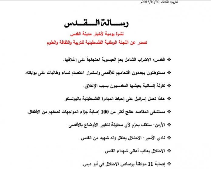 واشارت اللجنة الوطنية الفلسطينية للتربية والثقافة والعلوم انها تقوم بإعادة بث نشرة إعلامية يومية بعنوان "رسالة القدس" والتي تتضمن أخباراً عن كافة الممارسات و الإنتهاكات والإعتداءات التي تتعرض لها المدينة المقدسة من قبل حكومة الإحتلال والمستوطنين، كما تتضمن أبرز وأحدث التقارير والدراسات والأبحاث عن المدينة المقدسة، علماً بأن جميع الأخبار والدراسات التي تتضمنها الرسائل تعتمد على مصادر موثوقة ورسمية .