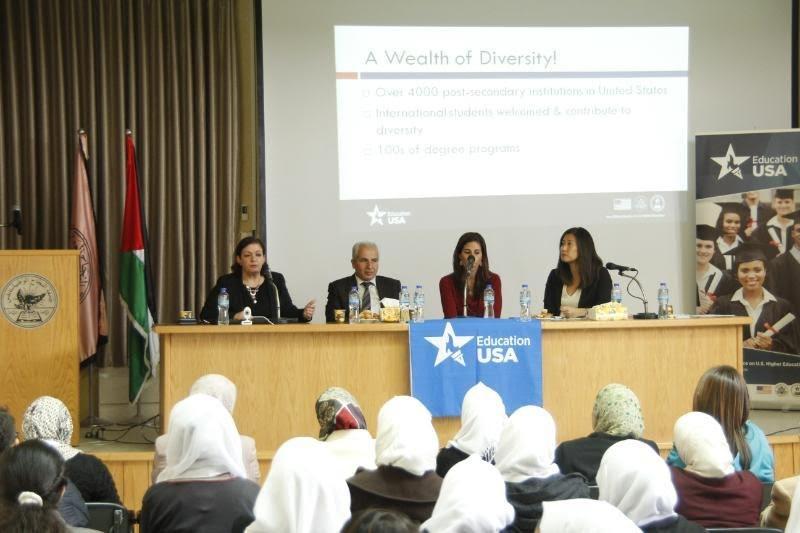 وتحدّثت السيدة تيم عن البرامج التي تقوم بإدارتها والمدعومة من وزارة الخارجية الأمريكية وبإشرافٍ من القنصلية الأمريكية، مشيرةً أن هناك أكثر من 400 مركز يقوم بتقديم المساعدات للطلبة من أجل الحصول على فرص دراسية في أمريكا، حيث أن جميع الفرص مفتوحة أمام الطلبة، موضحةً اَلية تقديم الطلبات وطرق إختيار الطالب للجامعة التي تناسبه، مشيرةً في الوقت ذاته الى أن الجامعات في أمريكا كثيرة وبالتالي يجب على الطالب أن يبحث جيداً.