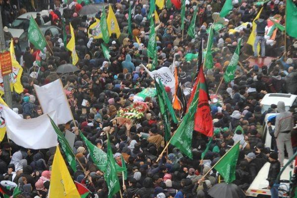على الأكتاف حمل 17 شهيداً من محافظة الخليل في موكب جنائزي ضم عشرات الآلاف، مرتدين العلم الفلسطيني، ومزينين بإكليل الورد، وفي التشييع تعالت التكبيرات والصيحات أكثر كلما امطرت السماء أكثر، وكأن لغة مشتركة جمعتهما في حضرة الشهداء.